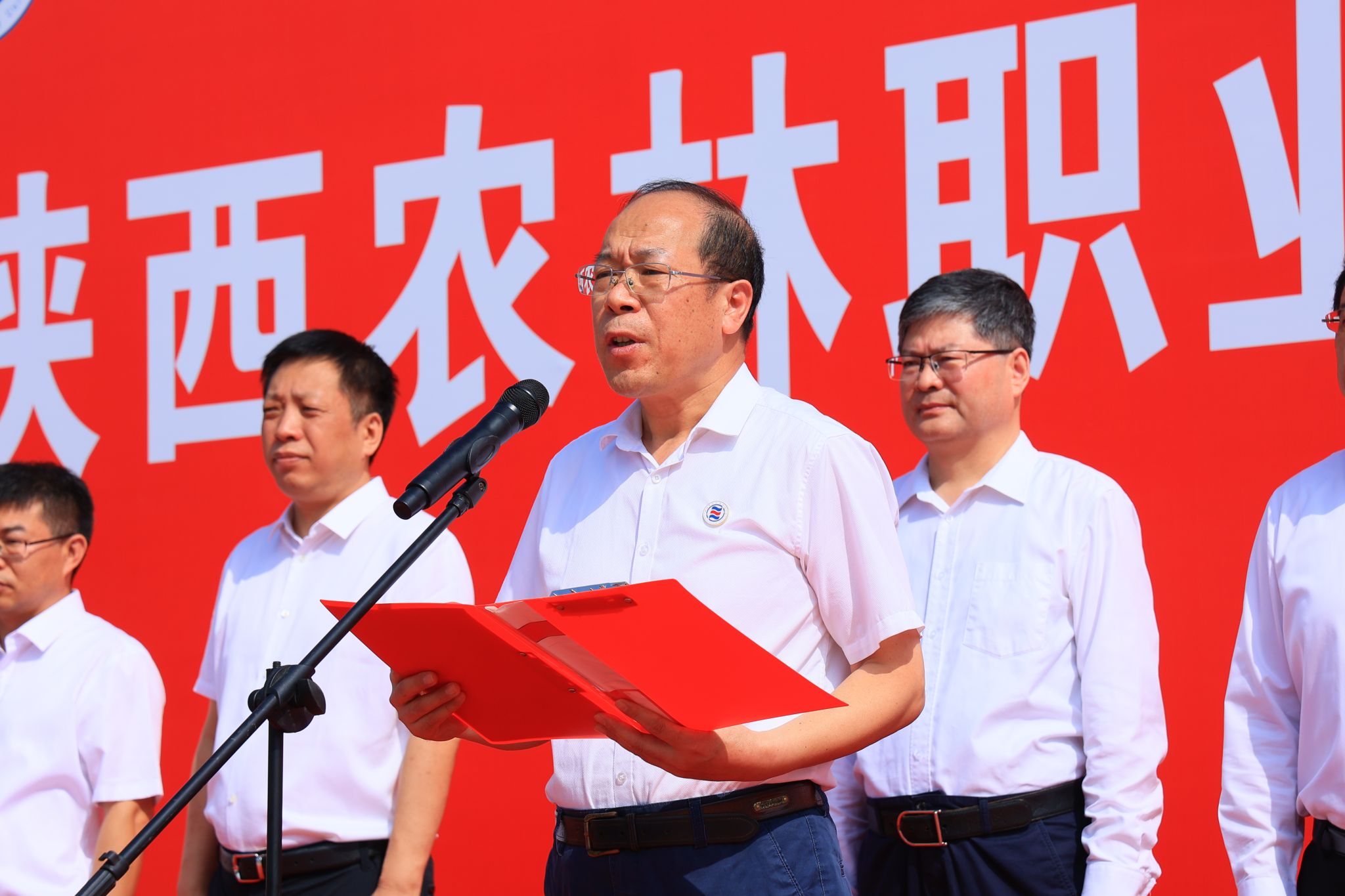 仪式上,黄思光、史高领、吴振磊、韩明军共同为陕西农林职业技术大学揭牌。吴振磊宣读了教育部批复文件。仲伟周代表学校致辞,并表示学校将站在新的历史起点上,坚定不移贯彻党的教育方针,以立德树人为根本,以强农兴农为己任,为加快建设“中国特色、世界一流职业大学”而不懈奋斗,在服务陕西和国家建设、推动农业农村现代化的时代新征程上,续写学校事业发展的恢宏新篇章。刘瑞明宣读了西北农林科技大学、杨凌示范区贺信。